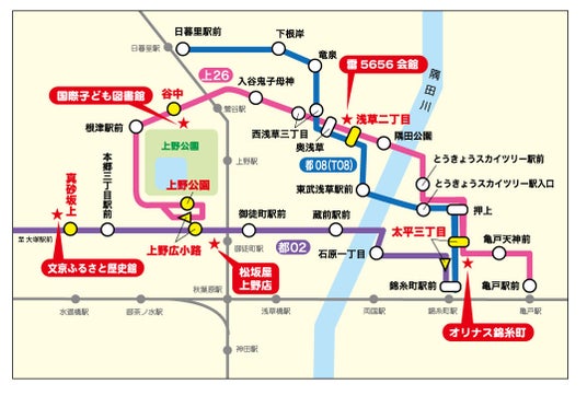 都02(大塚駅前~錦糸町駅前)、都08(T08)(日暮里駅前~錦糸町駅前)及び上26(亀戸駅前~上野公園)系統の沿線施設5か所にスタンプを設置しています(各施設には、「プリキュア」と「みんくる」のスタンプを1つずつ設置)。