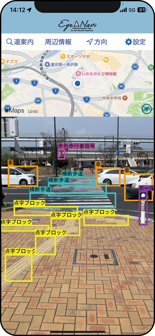 スマートフォンひとつで、道案内と障害物検出、歩行レコーダー機能を備えた歩行支援アプリです。
