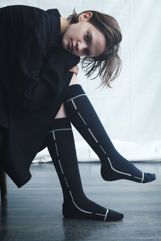 Y's、CHICSTOCKSとのコラボレーションソックス第3弾を展開。CHICSTOCKSの定番の「ライン」が印象的なモデルをベースに、Y'sの視点でアレンジしたライン着圧ソックスや、ラメ糸を使用した薄手のハイゲージソックスに加え、「Y」と「S」が後ろに配された起毛ソックスをラインナップ。