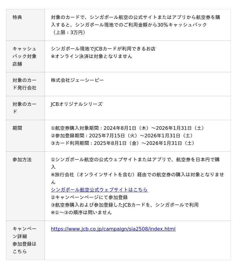 日本発唯一の国際カードブランド運営会社である株式会社ジェーシービー(本社:東京都港区、代表取締役会長兼執行役員社長:二重 孝好) の海外業務を行う子会社、株式会社ジェーシービー・インターナショナル(本社:東京都港区、代表取締役社長:陽川 勝樹)(以下、総称してJCB)は、2025年8月1日(金)より、シンガポール航空の公式ウェブサイトまたはアプリから対象のカードで航空券を購入すると、シンガポール現地での利用金額の30%をキャッシュバック(上限3万円)するキャンペーンを開始します。