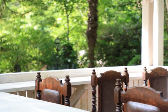 ウッドデッキには旧レストランで使用されていたレトロな椅子をご用意。いつも賑わっている人気の場所です