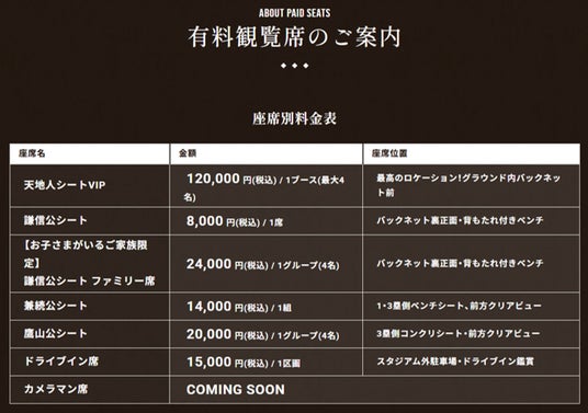 - 謙信公シート(バックネット裏1名)一般 8,000円、市民割 5,000円