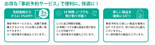 商品を事前にご予約いただくことで、店頭でのお品切れの心配がなく、商品を探し回る手間も省けます。また、免税価格からさらに5%OFF*で商品をご購入いただけるため、店頭よりもお得にお買い物をお楽しみいただけます。 *一部対象外の商品もございます。