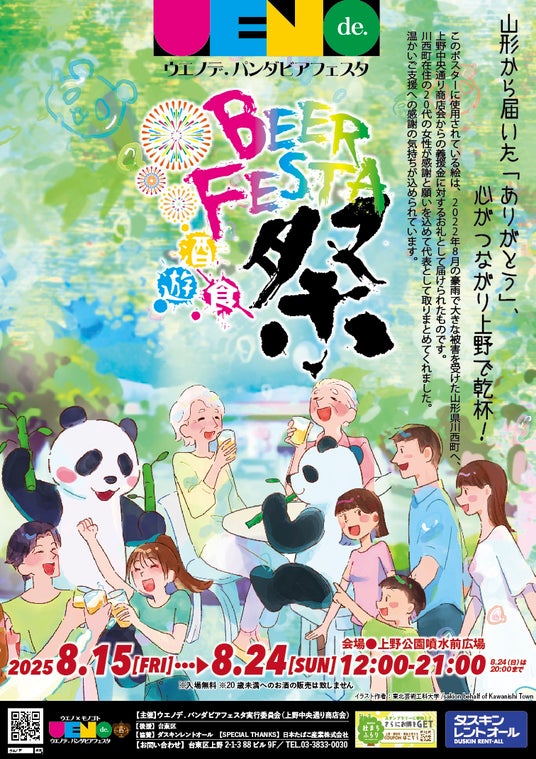 そして今年は、山形県川西町との「ありがとうのご縁」が込められた特別なポスターにもご注目ください。このポスターに描かれている温かなイラストは、2022年8月の豪雨災害で甚大な被害を受けた山形県川西町に、上野中央通り商店会から義援金が届けられたことへのお礼として、現地の20代女性が代表して感謝と願いを込めて描き上げたもの。まさに"つながり"と"感謝"がカタチとなったビアフェスタです。