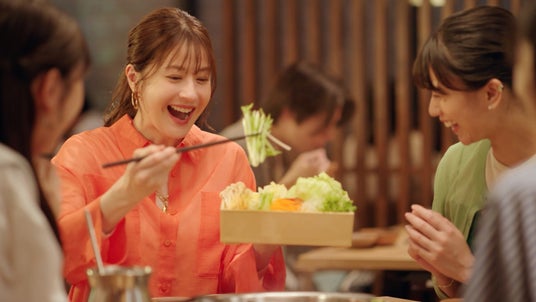 松本若菜さんが出演する本CMでは、友人たちと一緒に「しゃぶしゃぶ温野菜」で食事を楽しむ、あたたかなひとときを描いています。湯気の立つお鍋を囲み、お肉をしゃぶしゃぶ。一口頬張った瞬間、思わず笑顔に。「ね、美味しいよね!」と友人に声をかける松本さん。そして、もう一口味わったあとにこぼれる心の声--「この時間、幸せすぎる…」。かけがえのない"しあわせのしゃぶしゃぶ時間"を描いた、心温まるCMに仕上がっています。ぜひ、大切な人と「しゃぶしゃぶ温野菜」をお楽しみください。CM概要