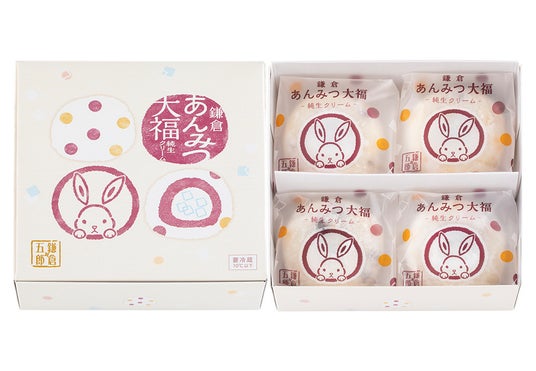 鎌倉五郎本店を代表する大人気の鎌倉銘菓といえばコレ!月うさぎを描いた大きな半月のおせんべいに、ふわっと軽いクリームがたっぷりはさまれたお菓子です。カリッと「おいしい音」がする、ほかにない香ばしい食感は、お子様からご年配まで圧倒的支持をうけています。風味豊かな小倉風味と抹茶風味の2味です。