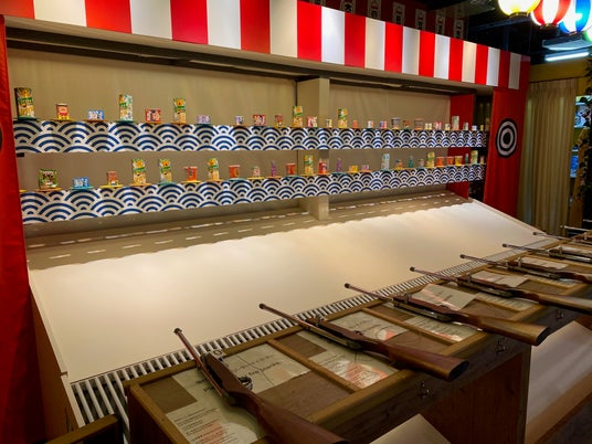 木のカウンター、駄菓子の並ぶ棚など、"あの頃"の縁日をそのまま切り取ったような、昭和の空気が息づく射的場