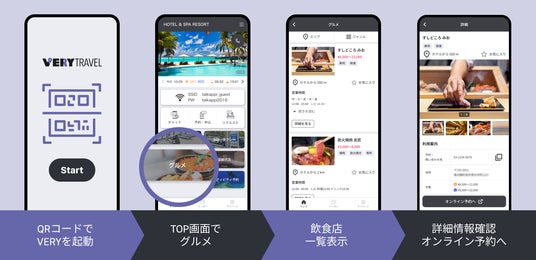 ゲストは、チェックイン時に配布されるカードや客室に設置されたQRコードをスマートフォンで読み取るだけで、宿泊施設の専用ページを開けます。館内案内や周辺観光情報、館内施設の混雑状況など、様々な情報を自身のデバイスに応じた言語で簡単に入手できます。また、レストランの順番待ち受付、ルームサービスの注文、付帯サービス・アクティビティの予約、チケット購入、デジタルクーポンの入手と利用、備品・アメニティ等のリクエスト、内線電話(施設との無料通話)、エクスプレスチェックアウトなど、旅ナカの様々な予約や申込、リクエストは、すべて「VERY」で完結できます。