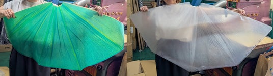 『ムーミン谷とアンブレラ』で展示されたカラフルなビニール傘は、回収され分解・洗浄を行い何層にも重ねて作り出されたPLASTICITY独自の素材「GLASS RAIN素材」に再利用されます。様々な色のビニール傘を4層にプレスすることで、同じ色の傘でも色の出方が異なり、透明な傘でもプレスされた際のしわの向きによってそれぞれの素材感やバリエーションをお楽しみいただける1点もののアイテムです。素材の特性により水や汚れに強く雨の日にも気にせずご利用いただくことができます。