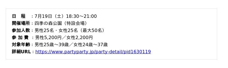 7月19日・20日の2日間限定、「中野四季の森公園」で婚活パーティーを実施