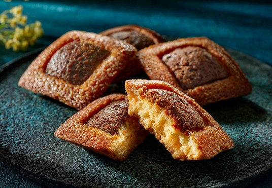 北海道発酵バターと香り高いスペイン産アーモンドを使ったバターフィナンシェ。表面を香ばしく焦がしたブリュレショコラスプレッドを埋め込んで、しっとりとジューシーに仕上げました。