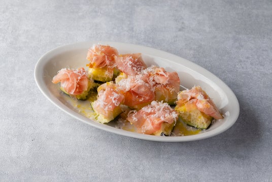 みずみずしい堺産のごちそうなすを手で割き、薄切り生ハム、グラナパダーノ、隠し味の金山寺味噌で仕上げた夏の前菜。