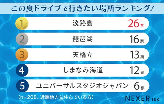 続いて人気なのは淡路島とユニバーサルスタジオジャパンが同率2位に。爽快な海の絶景や遊び心あふれるスポットが、夏のドライブ先として支持を集めています。
