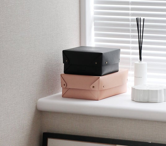 細々としたものを目隠しできる、蓋付きの収納ボックス。フェイクレザー素材に高級感が漂い、空間をすっきり美しく見せてくれます。