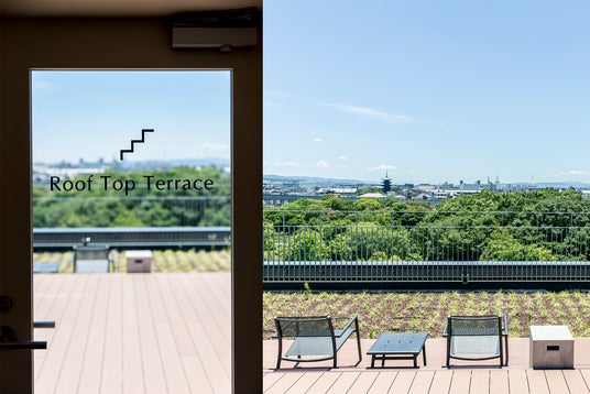 ポテルの屋上「ルーフトップテラス」は宿泊者限定でご利用いただけます。世界遺産の東寺と京都タワーを望める抜群のロケーションで、緑豊かな森を眺めながら、背筋を伸ばしていただけます。大きなヨガマットはポテルにご用意はございませんが、座れる小さなマットがありますので、座った形でのヨガのポージングも気持ちいいですよ。
