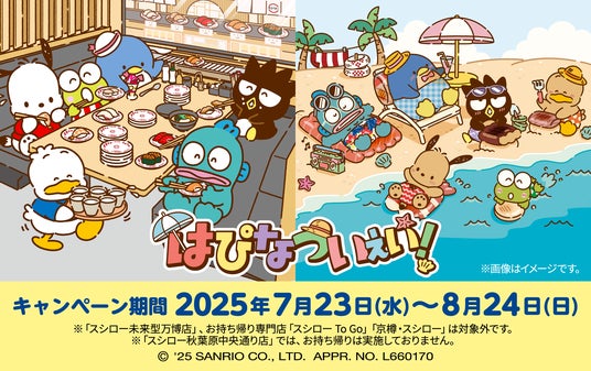 株式会社あきんどスシロー(本社:大阪府吹田市、代表取締役社長:新居 耕平)は、株式会社サンリオのキャラクターユニット『はぴだんぶい』とのコラボを7月23日(水)より実施いたします。