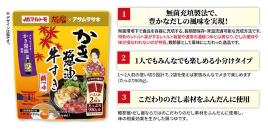 新商品「だし小鍋かき醤油牛すき鍋つゆ」は、2024年9月に発売した「だし小鍋かき醤油鍋つゆ」に続き、創業110年を超える老舗アサムラサキのかき醤油とコラボ。広島産牡蠣のうま味エキスと鰹、昆布、椎茸のだしをブレンドした万能だし醤油を使用し、さらに上質な鍋つゆに仕上げました。