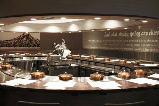 日本独自の食文化であるしゃぶしゃぶを、"一人しゃぶしゃぶ"で楽しんで頂くために、O型のカウンター席を中心に、一人に一鍋ずつご用意しています。伝統工芸の「曲げわっぱ」やオリジナルの銅鍋、掛川手織葛布の「のれん」など、各所に匠の技を体験出来るしつらえを施した空間でお迎えします。