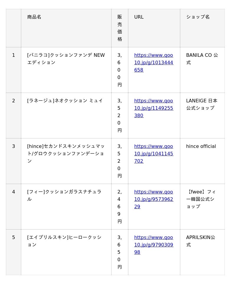 Qoo10(https://www.qoo10.jp/)サイト上、「クッションファンデーション」「リップメイク」「アイシャドウ」「チーク」カテゴリーの公式ショップ各販売個数に基づいたランキングです。
