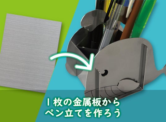 身近な製品に使われている「板金加工」を使ったモノづくりに挑戦。金属の板を用いてペン立てとオリジナルチャームを制作します。