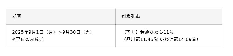 ・特急ひたち11号の車内放送は、「品川~勝田」「勝田~いわき」のそれぞれの区間で各1回のみ実施となります。