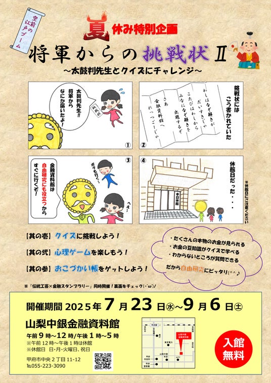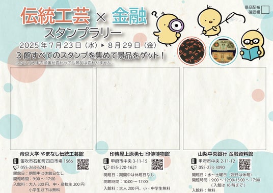 株式会社山梨中央銀行(頭取 古屋 賀章)および学校法人帝京大学(理事長 冲永 佳史)は、山梨県内の小・中学生を中心に、金融リテラシーの向上や地場産業への理解を深めてもらうことを目的として、山梨中銀金融資料館、やまなし伝統工芸館および印傳博物館の3館コラボイベント「伝統工芸×金融スタンプラリー」を7月23日(水)から8月29日(金)まで実施します。
