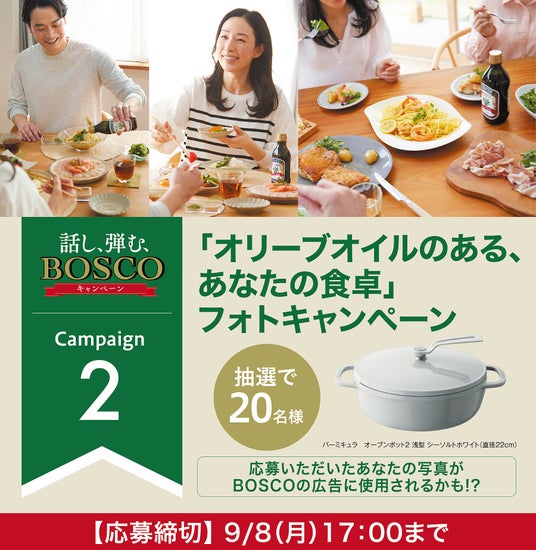 本企画は、アンケートに答えると抽選で100名様に「BOSCO」セットが当たるキャンペーンと、「オリーブオイルのある、あなたの食卓」の写真を応募すると抽選で20名様にバーミキュラ オーブンポット2が当たるフォトキャンペーンの2つを展開いたします。