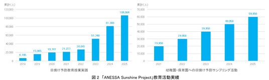 日焼け止めブランド「アネッサ」は、7月16日(水)に東京都港区立本村(ほんむら)小学校で、「日焼け予防教育授業」を公開実施し、児童たちに紫外線対策の重要性と日焼け止めの正しい使い方を伝えました。アネッサは、2018年より全国の小学校や保育園・幼稚園と連携し、累計16.6万人(図2)の子どもたちを支援してきました。2024年からは「ANESSA Sunshine Project」を発足し※1、2030年までにアジア12の国と地域※2で合計30 万人の子どもたちの心と身体の成長を支援することを目指しています。