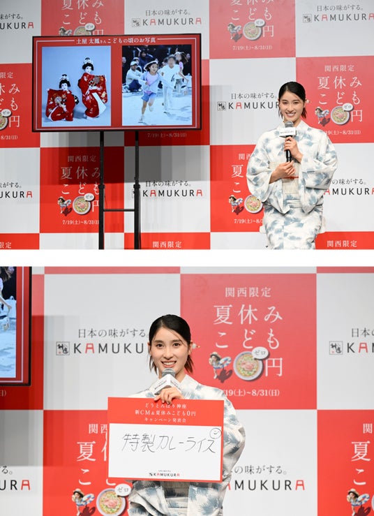 当日は「どうとんぼり神座」のブランドアンバサダーである土屋太鳳さんが、夏らしい白と水色の浴衣姿で登場。テーマについて聞かれると、「かなり暑い日が続いているので、涼しげな柄を選びました。ポイントとして、どうとんぼり神座のカラーである赤い帯締めをつけました!」と浴衣のポイントを紹介していただきました。新CMの撮影時のエピソードについて聞かれると、「子役の方が美味しそうにスープを飲んでいるのを見て、とてもほっこりした気持ちになりました。」と撮影の裏側を振り返っていただいた上で、撮影で再び「おいしいラーメン」を食べた感想について「一杯に全部の栄養が詰まっていて、心を包み込んでくれる優しい味です。本当に大好きなラーメンです!」と魅力を熱く語っていただきました。また、「どうとんぼり神座」が大切にしている「おもてなし」に関連して、普段の生活でおもてなしを感じたエピソードについて、「この前までやっていた舞台で、各地方の方に愛のあるおもてなしをしていただき、とてもパワーをもらえました。」とコメント。さらに7月19日から始まる神座の感謝還元期間にちなみ最近感謝したことについて聞かれると、「舞台の観客の方の拍手がとてもあたたかく、包み込まれているような気持になりました。」とほっこりするエピソードを教えていただきました。最後に、夏休みをもらえたらどうしますかという質問には「国内や海外の色々な景色や文化を見たい。先日もロケにいった際の海が綺麗で忘れられない思い出になりました。」とコメントいただきました。