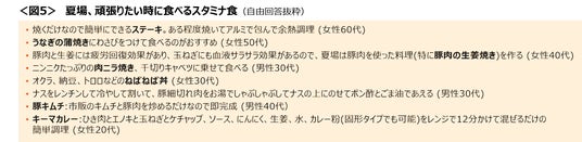 夏場、頑張りたい時に食べるスタミナ食は、ステーキやうなぎといったスタミナのつくイメージがある定番食から、電子レンジ調理や焼くだけで完成する手軽なメニューなどがあげられた。<図5>