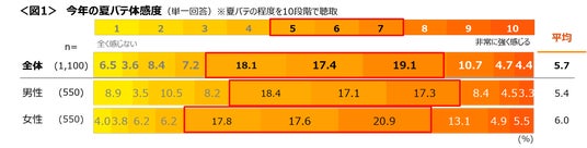 女性の方が「7」以上の回答が多く、男性より夏バテを強く感じている傾向にある。<図1>
