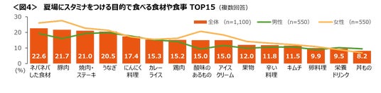 夏場にスタミナをつける目的で食べる食材や食事は、「ネバネバした食材」22.6%、次いで「豚肉」21.7%、「焼肉・ステーキ」21.0%、「うなぎ」20.5%が上位。