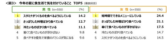 今年の夏に食生活で気をつけていることは、男性は「スタミナがつくものを食べる(14.2%)」、女性は「短時間でできるメニューにしている(24.4%)」がトップ。