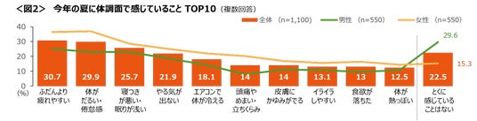 体調面では、「ふだんより疲れやすい」や「体がだるい・倦怠感」が上位で、体調不良を実感する人が多い。