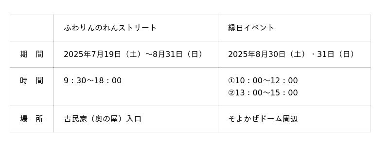 遊園地エリアそよかぜドーム周辺の会場では、縁日気分を味わえる「花すくい&ヨーヨー釣り」や、夏の思い出になる「サマーキャンドルづくり」等の体験をお楽しみいただけます。また、みはらしの丘ふもとの古民家(奥の屋)入口では、コキアのキャラクター"ふわりん"のデザインがほどこされたフォトジェニックなスポット「ふわりんのれんストリート(7/19~8/31)」も登場。のれんや提灯等など、夏らしい涼やかな空間を演出します。