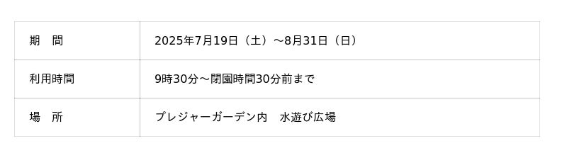 1.「水遊び広場」オープン7月19日(土)より「水遊び広場」がオープンします。水遊び広場では、「水のトンネル」、「噴水広場」、「ジャブジャブ池」の3種類の水遊びを楽しむことができます。水の壁を通り抜けたり、水辺で寝そべったりして、暑い夏でも涼みながら満喫できる当公園の人気スポットです。お子様の水遊びデビューにいかがでしょうか。