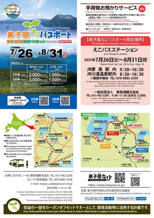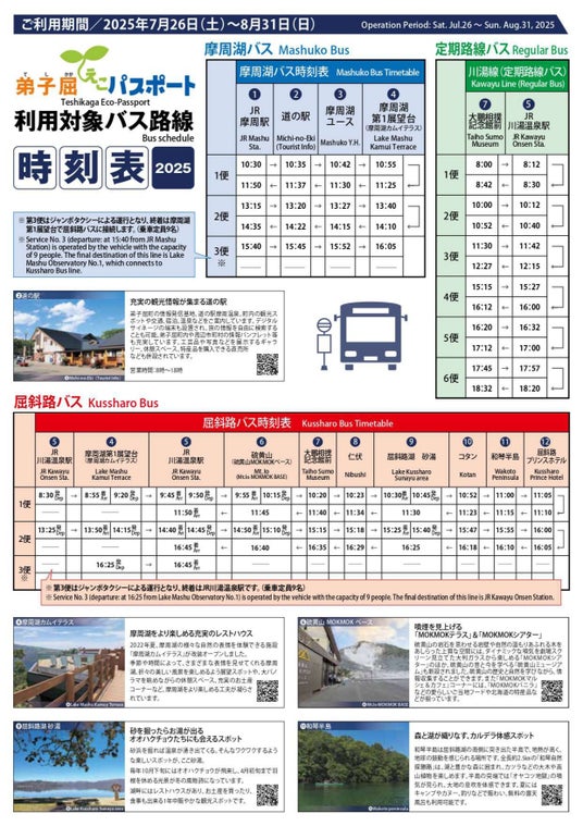 弟子屈町内の主要な景勝地をめぐる周遊バスチケット「弟子屈えこパスポート」は、2日券・3日券の2種類があります。事前にご予約の上、ぜひご活用ください。運転が不安な方や手軽に弟子屈で観光を楽しみたい方にもおすすめです。