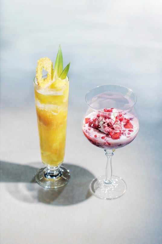 スモークとリフレクションをテーマにしたインテリアと最上階から臨む東京の煌めく景色が幻想的なスカイバー「エスカリエ」では、夏の宵を彩る2種のフルーツフローズンカクテル『Tropical(トロピカル)』と『Scarlet(スカーレット)』をご用意しました。どちらもフルーツをふんだんに使用し、グラスの中に丁寧に重ねた幾つもの素材が奏でる複雑な味わいと食感をお楽しみいただけます。夏の夜にふさわしい贅沢なカクテルで、特別なひとときをご提供いたします。