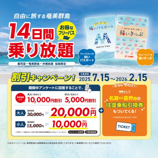 世界自然遺産の「奄美大島・徳之島」を含む奄美群島を結ぶフェリーでの船旅の利用促進を目的に、鹿児島県本土から奄美群島および沖縄本島を結ぶフェリ-乗船に使える14日間乗り放題乗船券を期間限定で割引販売します。マルエーフェリー(株)鹿児島営業所ならびに、マリックスライン(株)にて、期間中のアンケ-トにご回答いただいた方に限り、期間限定価格の大人20,000円(税込)、小人10,000円(税込)で販売します。夏休みを含むオンシーズンの奄美周遊の船旅をぜひお楽しみください。