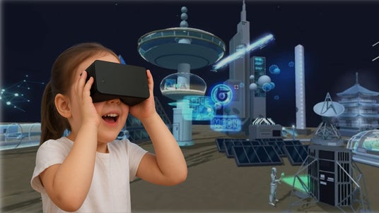 カードを月の地図に並べたら、VRゴーグルを使って、自分の作ったまちの中に入って体験できるよ!