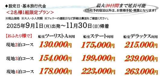 *全日程追加代金あり(1泊2名様1組あたり100,000円)