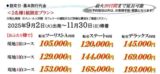 *全日程追加代金あり(1泊2名様1組あたり36,000円)