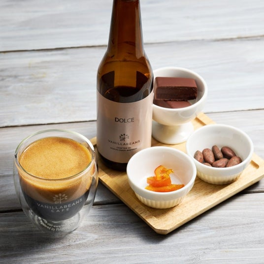 チョコレート製造時の副産物であるカカオ豆の外皮「カカオハスク」をアップサイクルして商品化したクラフトビール「DOLCE」に、チョコレートの原料であるカカオ豆を自家焙煎した「ローストカカオ」やプチショコラケーキ「パリトロ」、「蜜漬けドライオレンジ」などのスイーツを合わせた、店舗限定のカフェメニューです。