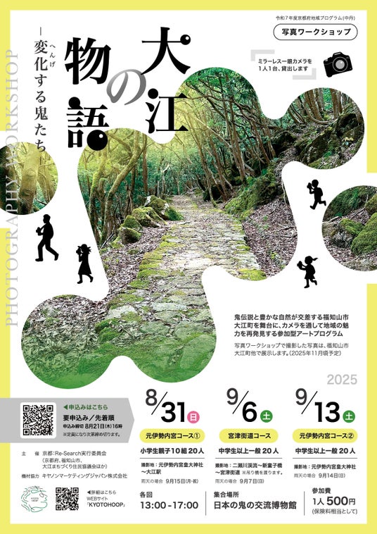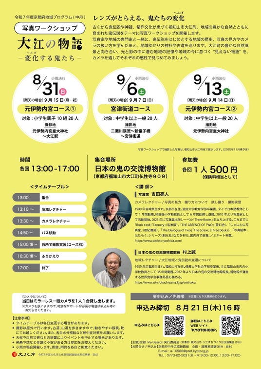 ■京都:Re-Search実行委員会(事務局:京都府)では、アーティストの目線や表現を通して地域の魅力を見つめなおす取組の一環として、8月31日、9月6日、13日に写真のワークショップを開催します。