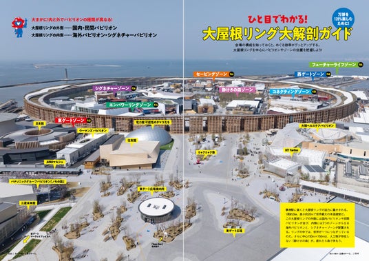 本書は大阪・関西万博の会場全体が一目でわかる「大阪・関西万博会場案内MAP」から、世界各国のパビリオンが集まるゾーン別パビリオンガイドをはじめ、見どころ満載のエリア情報を完全網羅しています。