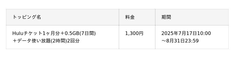 KDDI、沖縄セルラーは2025年7月17日から8月31日まで、povo2.0の期間限定トッピングとして、「Huluチケット1ヶ月分」と「0.5GB(7日間)+データ使い放題(2時間)2回分(注)」がセットになったトッピングを1,300円で提供します。
