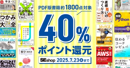 株式会社翔泳社(本社:東京都新宿区⾈町5、社長:臼井かおる)の運営する公式通販サイトSEshopは、2025年7月17日(木)から7月23日(水) まで、PDF版書籍の一部新刊含む約1,800点のタイトルが40%ポイント還元となる「SEshop PDF版電子書籍ポイントアップ週間」を開催します。