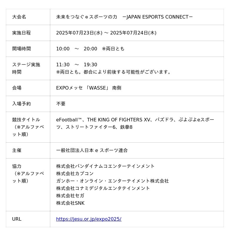 一般社団法人日本 e スポーツ連合(会長:早川英樹 以下、JeSU)は、7月23日(水)~24日(木)の2日間、EXPO2025 大阪・関西万博において実施する「未来をつなぐeスポーツの力 -JAPAN ESPORTS CONNECT-」について、ステージイベントのタイムテーブルが決定したことをお知らせします。あわせて、イベントの開催を記念して、JeSU公認PCを抽選で3名様にお届けするSNSキャンペーンを実施します。