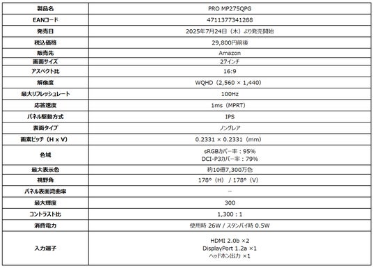 目に優しく、仕事に強い27インチWQHDモニター 100Hz対応、Eye-Qチェック機能搭載で快適なビジネス環境をサポート 「PRO MP275QPG」発売