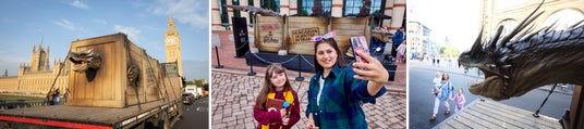 来日するドラゴンは、作中に三大魔法対抗学校試合(トライウィザード・トーナメント)の第一の課題においてハリーと戦ったドラゴンであるハンガリー・ホーンテールで、ロンドンのスタジオツアーで行われている映画公開20周年特別企画「トライウィザード・トーナメント~チャンピオン誕生の舞台裏~」の開催に合わせ、職人たちの手で丁寧に制作されました。全長約7.6メートルもの大きさのドラゴンは、アニマトロニクスによって頭や目、口が動き、咆える姿がまるで映画から飛び出してきたような迫力で、英国各地に現れたこのドラゴンに多くのファンが足を止め、多くの話題を集めました。